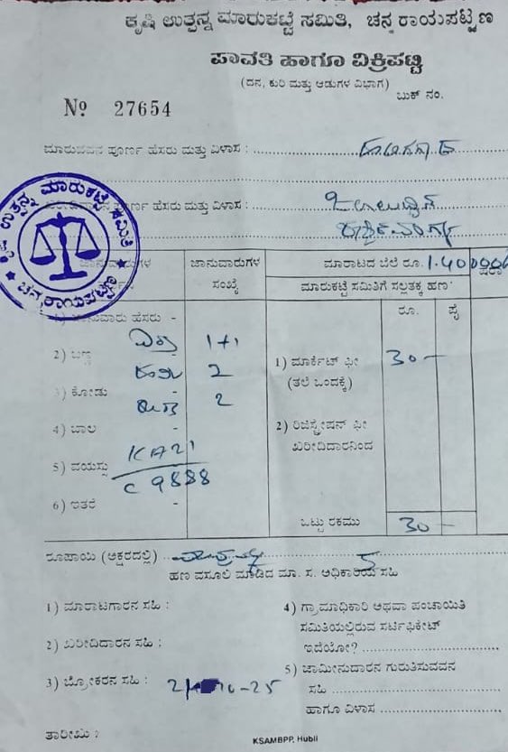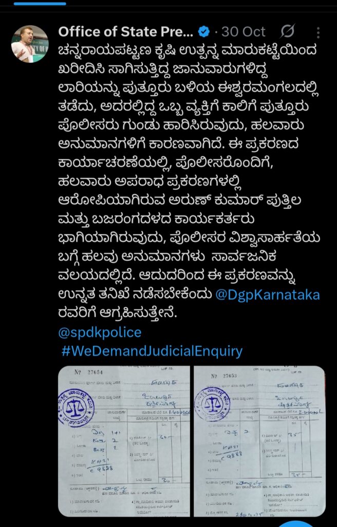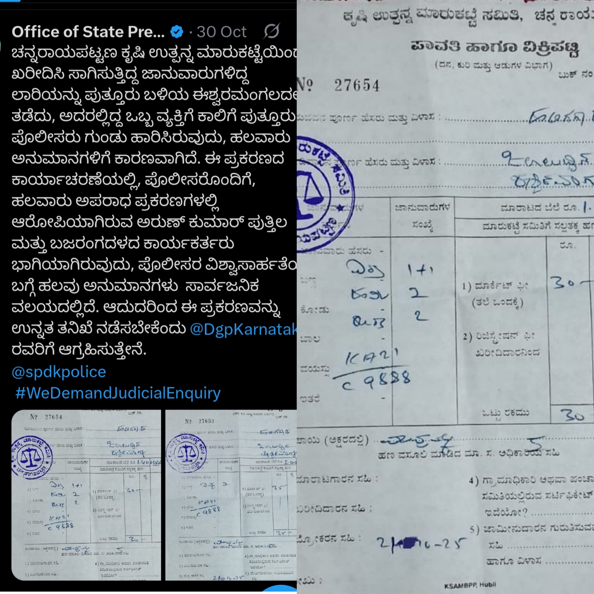 ಚನ್ನರಾಯಪಟ್ಟಣ ಕೃಷಿ ಉತ್ಪನ್ನ ಮಾರುಕಟ್ಟೆ ಸಮಿತಿ ಹೆಸರಿನಲ್ಲಿ ರಶೀದಿ (ಕ್ರಮ ಸಂಖ್ಯೆ 27653 ಮತ್ತು 27654) ಸೃಷ್ಟಿಸಿ, ಆರೋಪಿ ಅಬ್ದುಲ್ಲಾ ಅಧಿಕೃತವಾಗಿ ಜಾನುವಾರು ಖರೀದಿಸಿದ್ದಾನೆ ಎನ್ನುವಂತೆ ಸಾಮಾಜಿಕ ಜಾಲತಾಣಗಳಲ್ಲಿ ವೈರಲ್ ಮಾಡಲಾಗಿದೆ. ಈ ನಕಲಿ ದಾಖಲೆಗಳನ್ನು State Office SDPI Karnataka ಎಂಬ “X” ಖಾತೆಯಲ್ಲೂ ಹಂಚಲಾಗಿದ್ದು, ಎಸ್ಡಿಪಿಐ ರಾಜ್ಯಾಧ್ಯಕ್ಷರ ಖಾತೆ ಹಾಗೂ ಕೆಲ ದ.ಕ. ಜಿಲ್ಲಾ ನಾಯಕರ ಖಾತೆಗಳಿಂದಲೂ ಪೋಸ್ಟ್ಗಳು ವೈರಲ್ ಆಗಿವೆ. ಪುತ್ತೂರು ಗ್ರಾಮಾಂತರ ಠಾಣೆಯ ತನಿಖಾಧಿಕಾರಿಗಳ ವಿಚಾರಣೆಯಲ್ಲಿ, ಚನ್ನರಾಯಪಟ್ಟಣ ಕೃಷಿ ಉತ್ಪನ್ನ ಮಾರುಕಟ್ಟೆ ಸಮಿತಿಯ ಕಾರ್ಯದರ್ಶಿ ಈ ರಶೀದಿಗಳು ನಕಲಿ ಎಂದು ದೃಢಪಡಿಸಿದ್ದಾರೆ. ಅಲ್ಲದೇ ಜಾನುವಾರು ಸಂತೆ ಶುಕ್ರವಾರದಂದು ಮಾತ್ರ ನಡೆಯುತ್ತದೆ ಎಂಬ ಮಾಹಿತಿ ನೀಡಲಾಗಿದೆ.